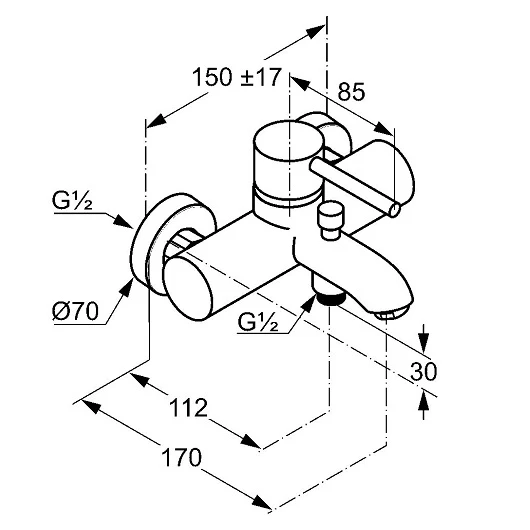Đầu chờ G1/2 – Tâm 150 +-17mm – Tâm vòi xả cách tường 170mm